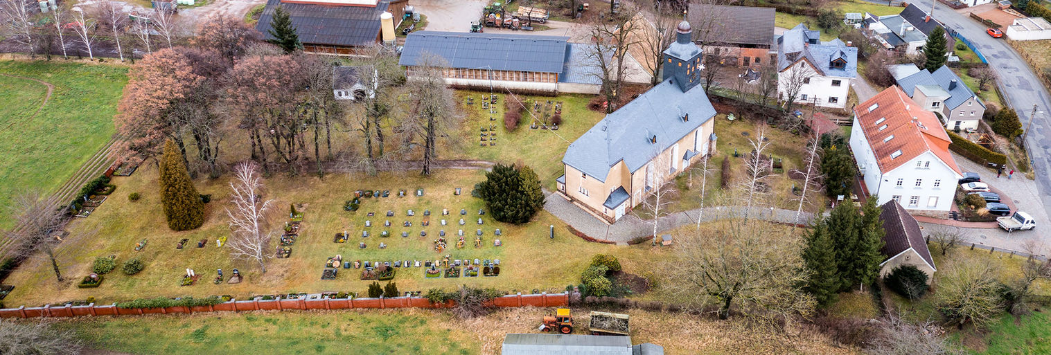 Der 0,6 Hektar große Kirchhof ist überwiegend mit einer roten Klinkermauer eingefriedet. Unter den verschiedenen Grabarten sind besonders die Grabstätten entlang der Mauer für den Friedhof charakteristisch. Der Abschiedsraum auf dem Friedhof gehört zur Gemeinde Lichtentanne. Vor der Kirche erinnert ein Kriegerdenkmal an die Gefallenen im Deutsch-Französischen Krieg. Ein weiteres Denkmal auf der Ostseite ist den Gefallenen aus dem ersten Weltkrieg gewidmet.